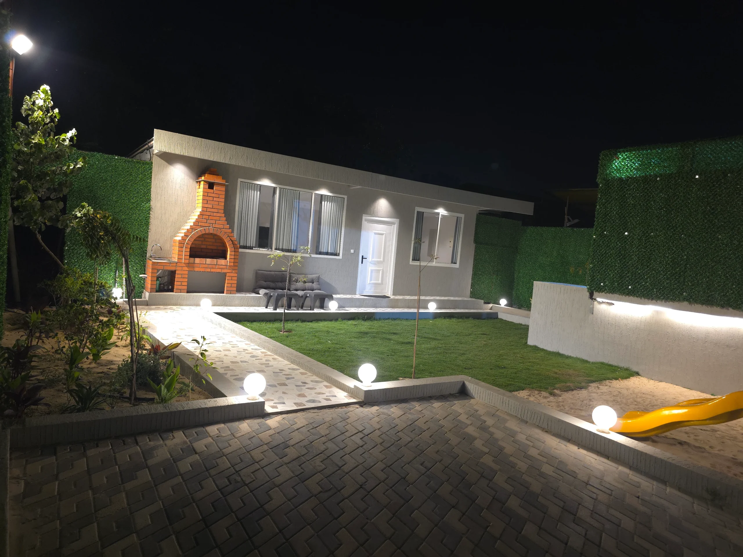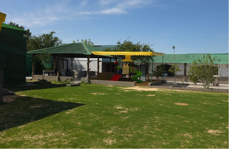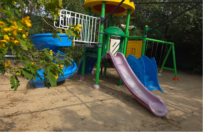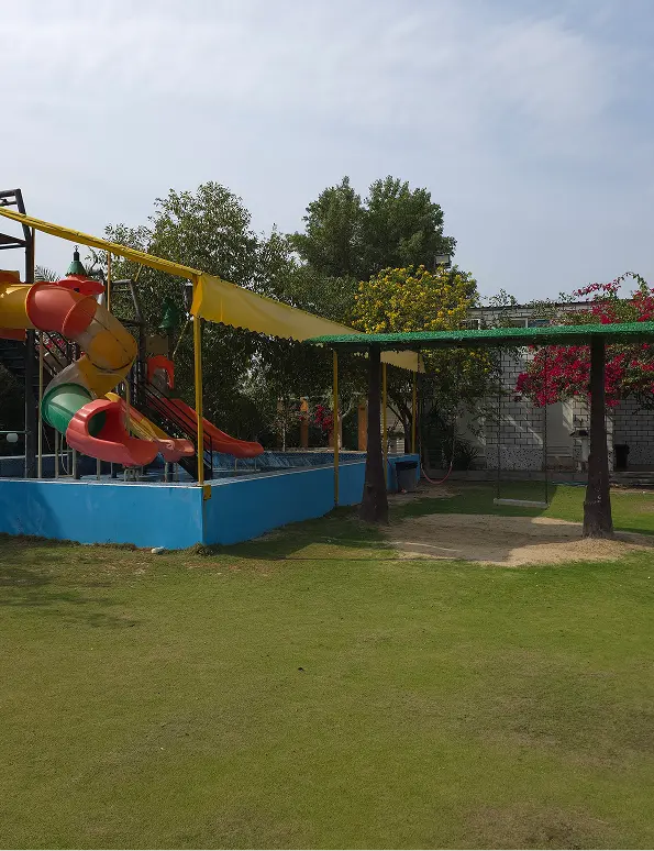 مساحة خضراء واسعة مع منطقة ألعاب أطفال جافة ومائية لوقت مليء بالمرح.